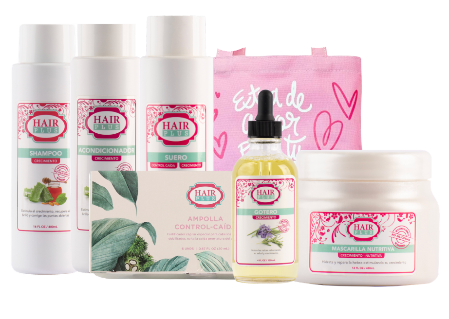 Shampoo 16oz - Conditioner 16oz - Suero 16oz - Gotero De Crecimiento - Mascarilla - Ampolla Anti-Caida 6 Unidades - Bolso